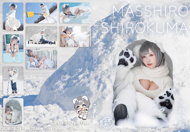 2026.01.03 Fave OSAKA 5の新刊です。 『MASSIRO SIROKUMA』 デジタル写真集 / 高画質jpeg / 350枚以上 白くまの女の子がかまくらを作ったり、釣りをしたり、氷の上で泳いでみたり、まっしろな冬景色ともふもふな白くまちゃんが可愛い冬にぴったりな写真集です。 紙媒体+αの大ボリュームです
